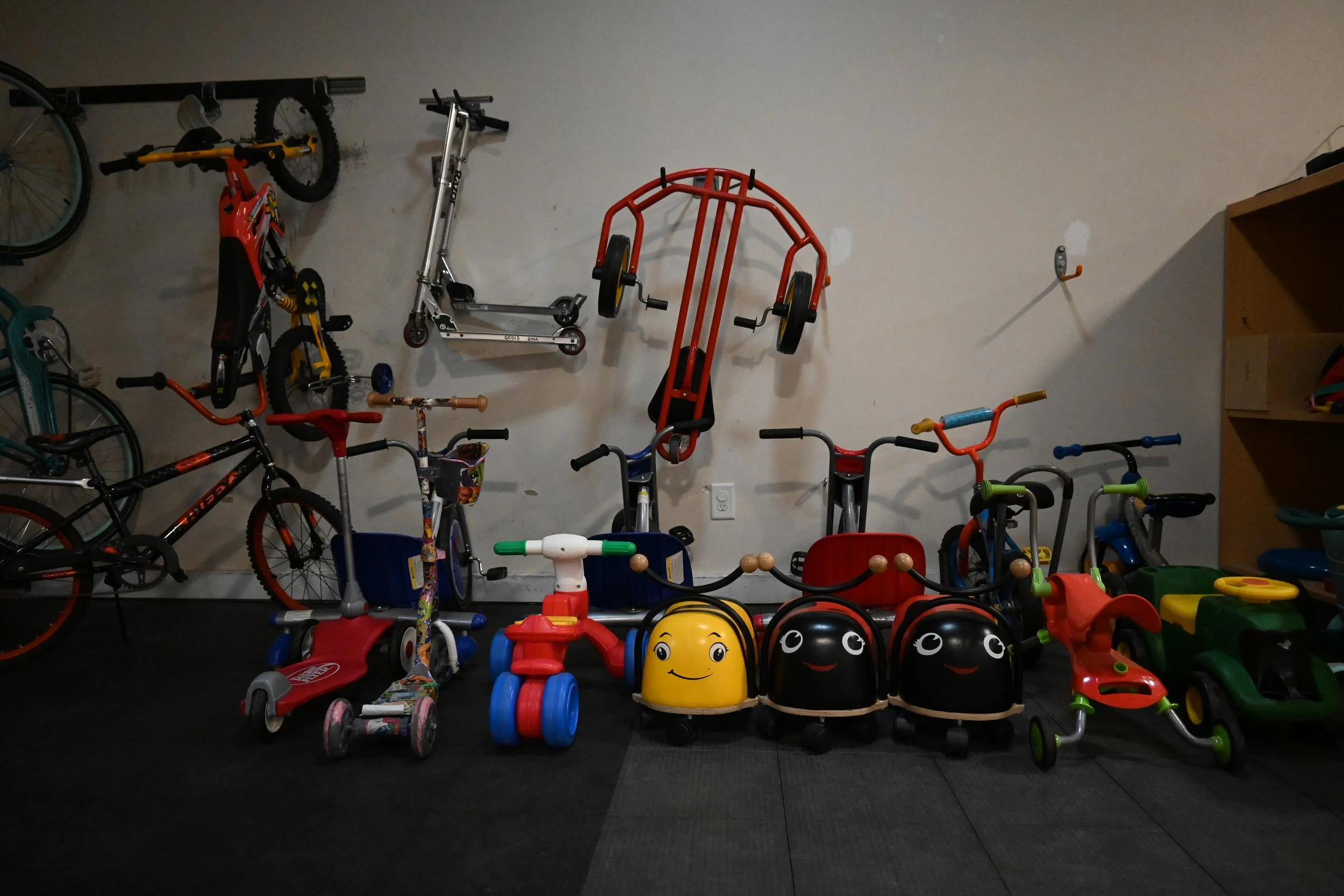 Our large gym is an exciting, energy-filled space featuring a jungle gym, zip line, bikes, and scooters.
